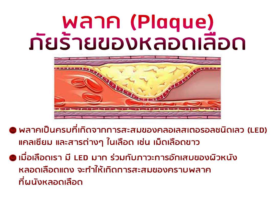 ➢ เมื่อเลือดเรา มี LED มาก ร่วมกับภาวะการอักเสบของผิวหนัง หลอดเลือดแดง จะทำให้เกิดการสะสมของคราบพลาค ที่ผนังหลอดเลือด