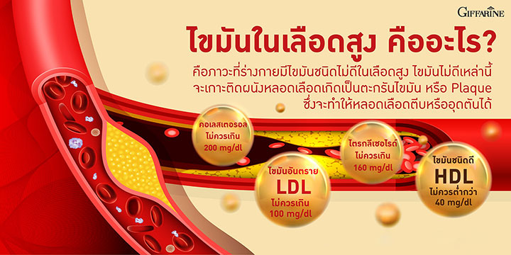 ◉ ไขมันในเลือดสูง คือ ภาวะที่ร่างกายมีไขมันชนิดไม่ดีในเลือดสูง ไขมันไม่ดีเหล่านี้จะเกาะติดผนังหลอดเลือดเกิดเป็นตะกรันไขมัน หรือ Plaque ซึ่งจะทำให้หลอดเลือดตีบหรืออุดตันได้